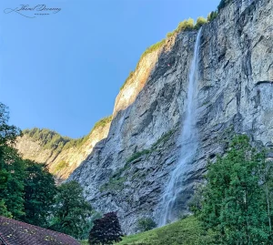 We hiked up to the Staubbach Falls and enjoyed a unique view of the village, the church and the valley from behind the thin curtain of water of the fall. The hike up is fairly easy with steps, however, be careful when approaching the viewpoint as it is a bit slippery from the water flowing down the tunnel.