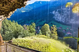 We hiked up to the Staubbach Falls and enjoyed a unique view of the village, the church and the valley from behind the thin curtain of water of the fall. The hike up is fairly easy with steps, however, be careful when approaching the viewpoint as it is a bit slippery from the water flowing down the tunnel.