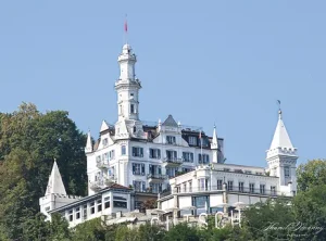 Catch a glimpse of the 5-star Château Gütsch on the mountain flank from the bridge.