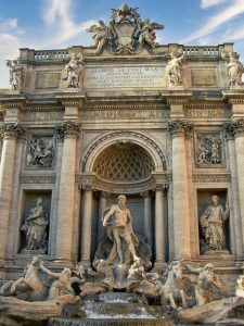 - The Trevi Fountain – A beautiful and very famous baroque fountain, it features a large central figure of Neptune, the Roman god of the sea, riding in a shell-shaped chariot pulled by sea horses. The fountain is also adorned with other mythological figures and sculptures, including two Tritons blowing into conch shells.