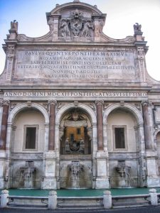 The fountain was commissioned by Pope Sixtus V in 1589, and it features a statue of the goddess Roma, who was the personification of the ancient city of Rome. The statue is made of marble and stands on a pedestal decorated with bas-reliefs of important events in Roman history.