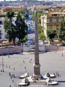 One of the most notable landmarks on Piazza del Popolo is the Obelisk of Ramesses II, a 24-meter-high Egyptian obelisk that was brought to Rome in ancient times and placed in the center of the square. The obelisk is flanked by four lions, which were added during the Renaissance.