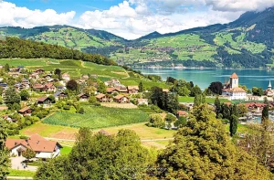 The natural scenery of green lush hills and vineyards, wooden houses perched on the mountain and the stunning views of the pyramid-shaped Niesen mountain, make it one of the most beautiful little town.